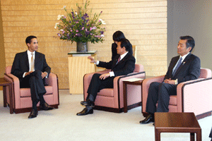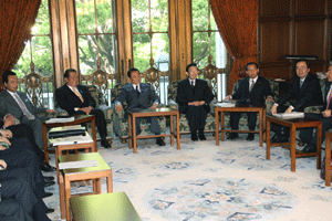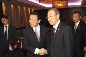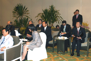 ぶら下がりインタビューが終わってから、息つく暇もなく、今度は、パン・ギムン国連事務総長と総理との会談が宿舎内で行われました。会談では、金融危機や北朝鮮問題、気候変動問題などに対し、日本と国連が緊密に協力して取り組んでいくことが確認されました。また、そのほかにも、ソマリア、パキスタン・アフガニスタン情勢などについて、幅広い意見交換がなされ、国連安保理改革についても議論が行われました。予定時間を大幅に超えて、真剣な議論が行われましたが、終始和やかな雰囲気の中で会談は進みました。
