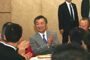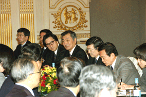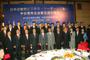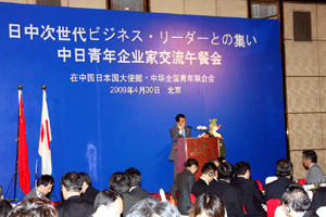 また、懇談の冒頭には麻生総理が、「日中次世代リーダーに送る私の応援歌」と題した、非常に熱のこもったスピーチを行われました。「応援歌」と呼ぶにふさわしく、総理からは、次世代を担う若いリーダーの方々に対して、力強い激励のメッセージが伝えられました。総理は、最後に、拳を振り上げながら中国語で「日中の若人よ、頑張れ!(リーチョンニェンチンレン・ジァヨウ)」と述べて、スピーチを締めくくられました。
