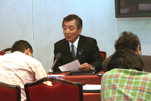 会談後、パン・ギムン国連事務総長との会談の結果について、同行記者団の皆さんにご説明をしました。次の日中首脳会談までには時間があまりなかったことから、夕食をほおばりながら大急ぎで準備し、ご説明に臨みました。時間の制約はありましたが、急ぐあまり内容が不十分にならないよう、注意をしながら説明させていただきました。