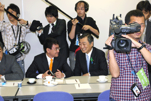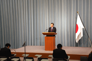 2つの首脳会談を終えて、本来ならほっと一息つくところですが、麻生総理は、会談終了後、すぐに宿舎近くの国際クラブ飯店に移動して、国内外の記者の皆さんに対して今回の訪問の成果などについてお話しする内外記者会見に臨まれました。会見では、新型インフルエンザ対策、北朝鮮問題、日中協力の進展状況、衆議院の解散を巡る考え方などについて質問が出されました。この会見の模様は、NHKで生中継されました。