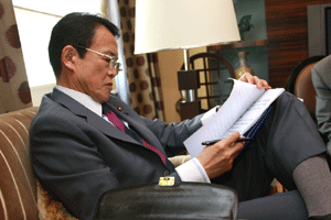 宿舎に到着するると、休む間もなく麻生総理は次のスピーチの内容の点検に入りました。本当にタフだなあと感じるのは、このような頭の切り替えの必要なときにいやな顔や疲れた顔を見せず、とても積極的に動かれることです。しかもいつも笑顔を絶やさず・・・。