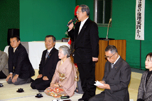 前田聖峰会長は、「杉の職人が真っ黒になった手を綺麗にするにはどうしたらよいかという話がテレビで和風総本家という番組でやっていた。正解は鳥の糞で洗うと綺麗になるそうです。職人が考え出した技術や知恵というものを生かした洗練された道具を使っている。今回の展覧会は夏とはまた違い、カナの出展数が増えました。94点のうち50点がカナで44点が漢字です。浜展は今年で60回、同人展も54回。連盟は65周年を迎える」と挨拶で語りました。