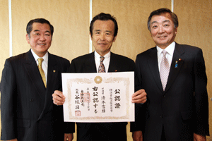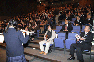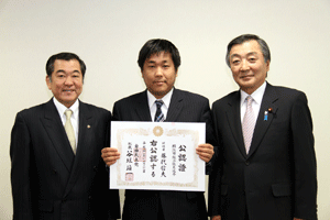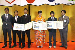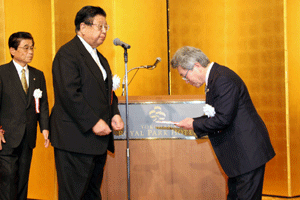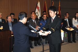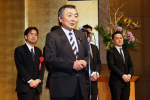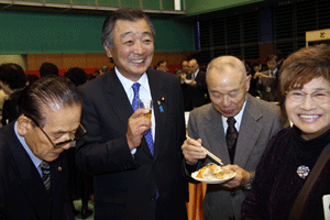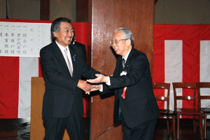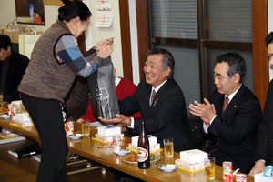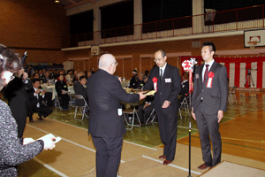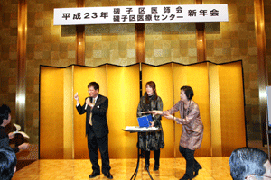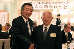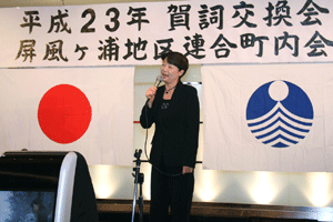 次は、金沢区の賀詞交歓会です。乾杯直前に到着し、ご紹介を受けました。各地域でご活躍の皆さんに新年のご挨拶をする機会を得ました。また、恒例の「金沢区表彰」は、(1)牡丹賞(個人)▼石上優大様(釜利谷中学)→第9回全国小中学生マウンテンバイク大会・男子中学1年生の部優勝、▼佐志原美潮様→マイクロソフトオフィス世界学生大会2010のエクセル部門優勝、▼山崎つづみ様(金沢中学)(欠席)→エアロビクス全国こどもチャレンジカップ第5回全国大会・チャレンジサーキットのユース部門優勝、(2)山桜賞(団体)▼関東学院ウィンドサーフィン部→全日本学生ボードセイリング選手権団体優勝、以上でした。表彰された皆さん、おめでとうございました。