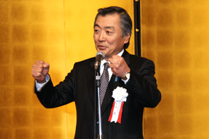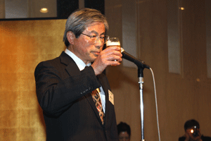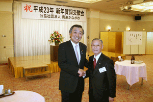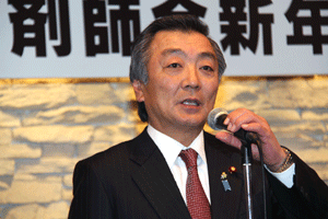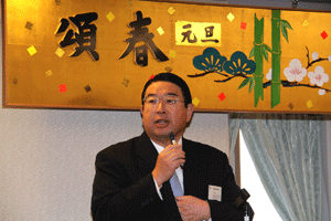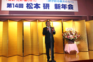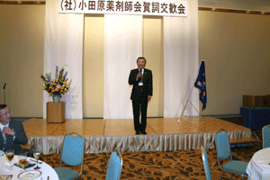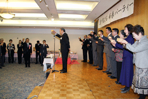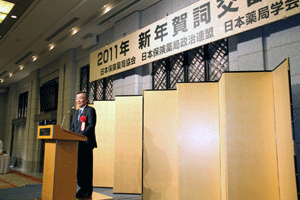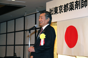 前納会長の年頭のご挨拶の要旨は「協励会は次の4つの基本目標に基づいて活動する。@協励精神の高揚(支部会等を通じて仲間とのつながりの中で自分自身を高め仕事を含めた活動を通してお互いに信頼し尊敬し合える関係をつくることが大切)、A国民の保健衛生への貢献(仕事を通して地域の医療、介護や保健衛生に貢献できることを喜びとする)、B協励薬局の繁栄(目標に基づいて活動することが自分たちの薬局繁栄につながる)、C会員の増加および育成(将来の組織が今以上に繁栄していくには新しい仲間を迎えお互いに切磋琢磨し合うことが大切である)」とのことでした。また日邦薬品工業株式会社の馬場正雄社長からは自信に満ち溢れた元気なご挨拶がありました。明るく活気ある新年会でした。