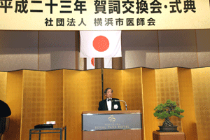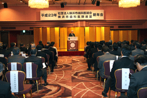 坂田隆一会長から、「1970年代になり歯科大学が増え先進医療も開発され、80年代90年代と医療費改定、歯科医の増加に伴い需用と供給ねバランスが崩れ我々の業界も疲弊してきた。2000年代になり厚労省の締め付け、点数制度の改定、戸別指導など緊張の中で患者に接している。今年は磯子歯科医師会の組織率をアップしたい。現在80%の加入率でまだ20%の歯科医が未加入。パンフレットを作り加入促進のアピールをしたい。又一般社団法人化を目指しステータスを上げて行きたい」とのご挨拶がありました。