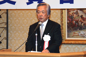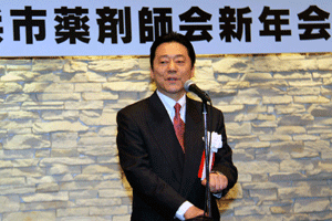 寺師三千彦会長から「薬剤師会は国民に見える薬剤師会にならなければならない。6年生の学生が実務実習やっているが、実習生に将来どうするか聞くと、街の薬局に務めたいが不安。しかし夢を持ち国民の為に尽くしたいとの思いある。われわれはその不安を払拭しなければならない。私は人が大好き。人は機械でもなければ歯車でもない。薬剤師も人により成り立つ。国民の皆さまの為に日薬、県薬、市薬と共に役立つ薬剤師会にしたい。」と挨拶がありました。