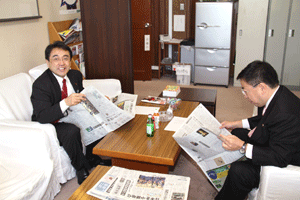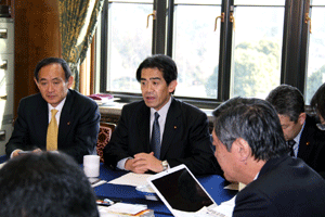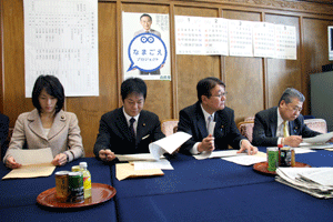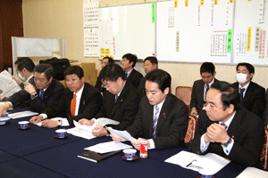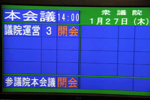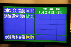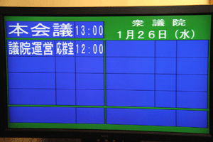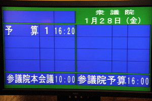 今日の国会は参院本会議で代表質問が行われます。また衆参で予算委員会が公報上セットされていますが、これは民主党国対の判断によるものか分かりませんが、予算委員長の職権でのセットのようで、事前に野党からの合意が得られていません。国会は冒頭から強引な与党の国会運営で動き出せない状態に陥っています。我が党の国対メンバーは情報収集のため控室に集合しています。