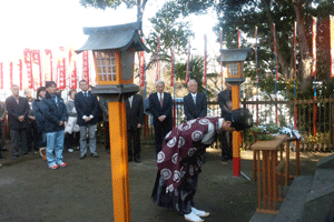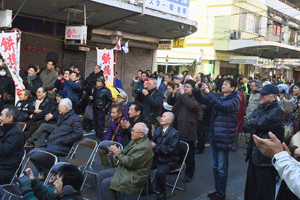 厳島神社節分祭が羽衣町の厳島神社で開催されました。式典に先立ち藤木幸夫節分会会長より「今日は皆さん大勢お集まりいただき感謝に耐えません。厳島神社は港に関連する山下町や伊勢佐木町、馬車道などの町内会の鎮守様です。節分にしても大祭にしても龍山宮司が守っていただいているこの厳島神社に皆が集まって一緒にいることが良いことだと思います。今イスラムなど地球上が非常に血なまぐさくなってきていて、我々の生活もどうなっていくんだろう、どういう危険がどういうかたちで目の前に現れるのだろうかと考えます。しかし今日本は世界一安全な国になっています。それは日本人が世界一警察官を信頼しているからです。そのことが日本が世界一安全な国になっているのです。一番大事なのは感謝です。神様の前で感謝をすること、お祈りをしっかりすることが大切。これから皆さんと地域の為に祈っていきましょう」との挨拶がなされました。本殿で龍山賢一宮司により節分祭式典が斎行された後、総代の皆さんと一緒に豆まきをいたしました。(秘書古正報告)