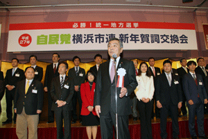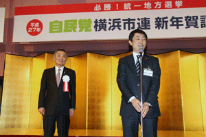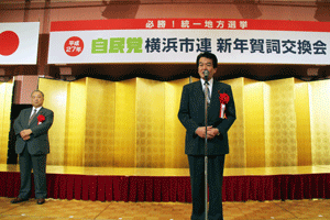 横浜小売り酒販磯子支所新年会にお招きいただきました。開会にあたり天沼支所長より「明けましておめでとうございます。昨年は不景気でした。消費税のアップがあり、夏は天候不順でビールが売れず、年末のギフトシーズンでは選挙がありました。ただ良いことと言えば、自民党政権が継続した事です。地方創生と言われていますが、是非地域の商店街で買い物をする様にしていただきたいと思います」との挨拶がありました。続いて来賓のご挨拶があり、私も松本純代理として一言お祝いを述べさせていただきました。(秘書斎藤報告)