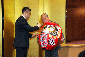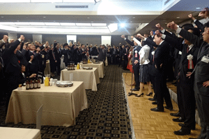 神輿保存会京濱連合新年会がロイヤルホールヨコハマで開催されました。安西春義会長より「昨年は京濱連合の行事にご協力をいただきまして誠にありがとうございました。これからも京濱連合は日本の伝統文化であります神輿道を継承して更なる飛躍をしていきたいと思っています。皆様のご協力とご支援をよろしくお願いいたします」との挨拶なされました。乾杯の音頭では横溝幸一筆頭顧問より「毎年渡御をさせていただいております伊勢佐木町では何といっても日枝神社のお三宮の連合渡御だと思いますが、終戦後6年目の昭和26年に連合渡御が再開され、戦後の痛手の残る街に何と60基の神輿が集まったと先日お聞きし感動いたしました。京濱連合も見習って今年も頑張っていきたいと思います」との挨拶で懇親会 に入りました。(秘書古正報告)