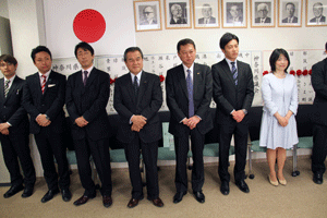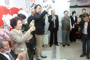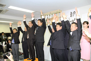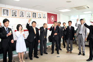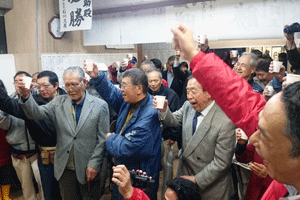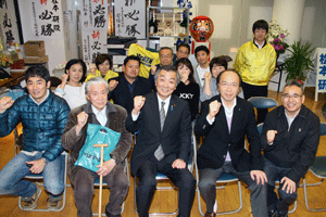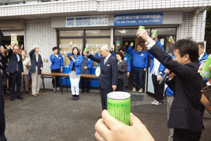 伊波俊之助市会議員選挙候補の出陣式が伊波俊之助事務所で執り行われました。伊波洋之助前市議から子息俊之助候補へタスキが掛けられ、藤木幸夫横浜港運協会会長の応援演説がなされました。全員で勝つぞコールがなされ、俊之助候補は宣伝車に乗り込み街頭遊説に向かいました。(秘書古正報告)