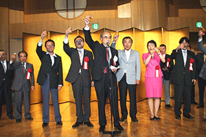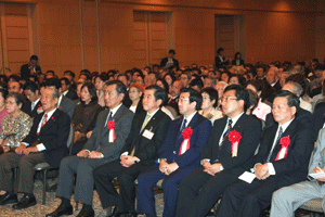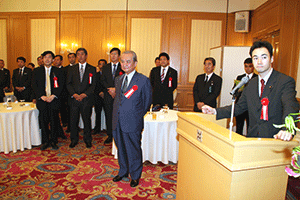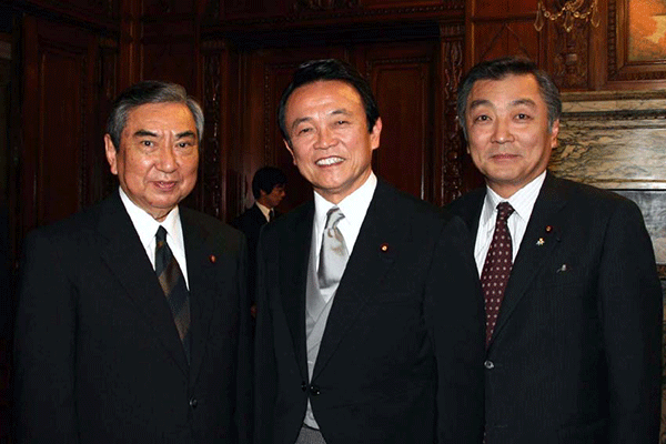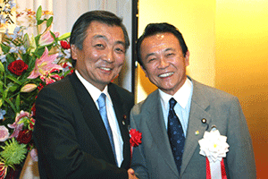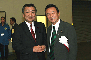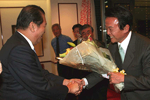 麻生太郎議員は、「四半世紀にわたり支援していただいてきている地元支援者の皆さん、党内外の議員諸先輩に感謝。そして世話になっている秘書、さらに家族にもこの際感謝(笑い)。昨年逝去された亀井善之議員も自分と同期で、本来ここに立っているはず。ここに居ないことは寂しいが共に表彰を受けたと受け止めたい。さて、これまでを思い返すと、昭和58年三期目の衆議院選挙で落選。結婚したのが11月3日、選挙に落選したのが12月18日。新婚1ヶ月半で亭主は無職(笑い)。深刻に受け止め 自分は落ち込んだが、一方支援者は落選も一興と楽しむことにしたそうだ。落選の後、東京をふらふら歩いていると、ばったり田中角栄に遭遇。田中角栄に何票とったと聞かれ、私は『自分は75,412票。共産党の78,090票に負けた』と答えた。落選したからといって全部の自分を変えるな、勝利に必要な80,000分の2,678(負けた票差)だけ自分を変えろと言われた。あまり理論的とは思えないが、それは私を納得させる説得力は十分にあった(笑い)。自分をあまり変えなくてよいのだ、自分に足りないところを補い、本物たるべしと生きようと決意。お蔭さまで昭和61年に134,179票を得て返り咲き、以来連続当選を続けてきた。当時筑豊は石炭公害などで経済は疲弊し厳しかったが、 九州工業大学に日本で始めてのIT学科を立ち上げ、人材の育成に力を入れてきた。地元の優秀な人材が育ち、今や九州トヨタ、日産、ダイハツなどの活躍で自動車産業では愛知県に次ぐ日本第2位の産業県福岡になった。地方経済が伸びるのは潜在的な人の力を伸ばすこと。日本には底力がある。日本の将来、未来に自信を持って進んで行きたい(要旨)」と謝辞を延べられました。