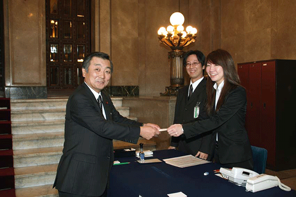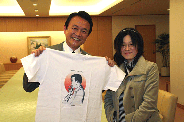 素敵なお嬢さんが我が事務所を訪れました。息吹山女さんという方が保守工房さんとともにつくったTシャツを持ってこられ、麻生大臣に是非、直接お届けしたいというリクエストでした。運のよい人ですね、山女さんは・・・。ちょうどこれから麻生大臣のところへ行く用事があり、 麻生大臣に確認したら、同行してよろしいと言う回答があったのです。本人は何が起きているのか訳の分からないままだったと思いますが、そこで「俺について来い」とばかりに、一緒に外務省へ飛んで行きました。 そして麻生大臣に、にこやかに迎えていただき、「麻生太郎先生の大ファンで、電話で許可をいただいたTシャツが完成したので一部お届けに来ました。」と 挨拶された山女さんから、要望通り直接大臣にTシャツを手渡すことが出来ました。山女さん、夢が叶ってよかったね!
