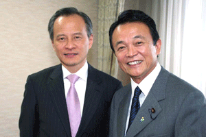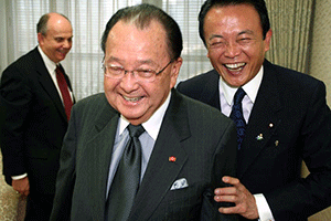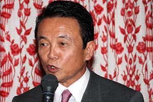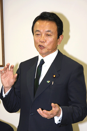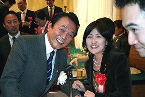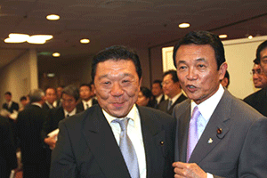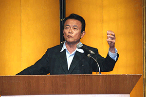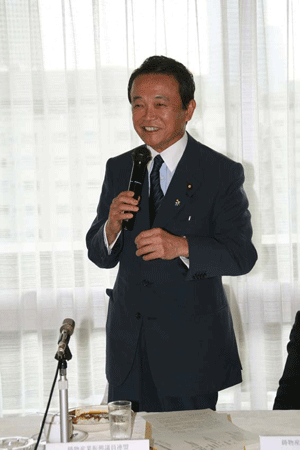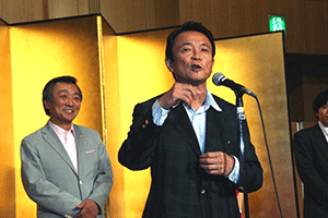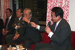 鳩山会長誕生を祝い乾杯がなされ、麻生太郎外務大臣から外交問題について講演がありました。内容は残念ながらここでは申し上げられませんが、私はこの話を聞くだけでもこれからの日本の進路を見誤らないなと強く感じます。今日も超元気な麻生太郎閣下でした。