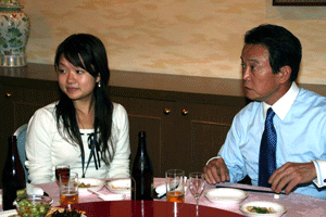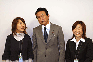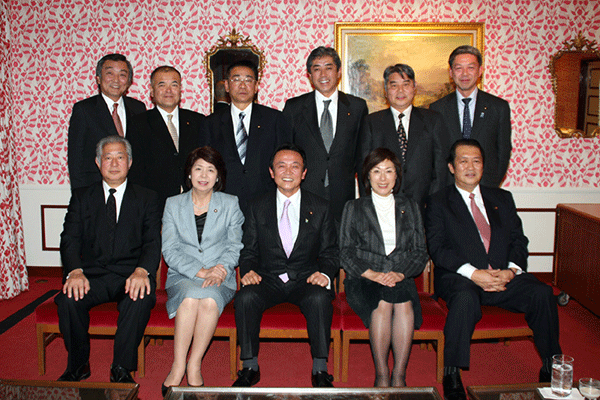 東洋英和女学院大学国際社会学部では、毎年恒例のカリキュラムに、政治及び国会議員の活動についての体験学習が盛り込まれています。20歳を超える成人3年生の皆さんはインターンとして 国会議員秘書さんの案内でいろいろな経験を積みます。今日は為公会の例会見学に、増田桃子さんと古木あゆみさんが来訪されました。お二人は開会前に為公会のメンバーに紹介され、 麻生太郎外務大臣と直接会う機会を得ました。こんな機会はそうはありませんので、この際とばかりに記念写真を撮ってしまいました。これを機会に若いお二人には是非政治に関心を持っていただき ますよう、また記念写真をよい思い出にしていただきたいと思います。