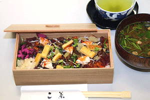 今日の為公会のお弁当は大当たり。私の大好きな「二葉」の散らし寿司弁当だったのです。具の大きさと寿し飯との混ざり具合が何ともいえない歯ごたえ、食感をつくり出します。具は、ズケマグロ、イクラ、アナゴ、エビ、カズノコ、カニカマ、タマゴ、シイタケ、カイワレなどです。写真を撮ってニコニコ昼食を楽しんでいると、先輩方が変な顔していました。