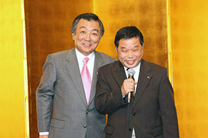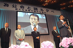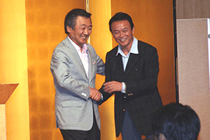 開会時に何の前触れも無く、いきなりのサプライズは堀内孝雄さんの吉田茂元首相を描いた映画「小説吉田学校」の主題歌「少年たちよ」の熱唱。皆さんは、最初は誰が登場したのかも分からずキョトンとしていましたが、歌が始まると「ウォー」と歓声があがり大盛り上がり。「麻生さん、頑張れ〜!」との堀内さんからの激励に、麻生太郎会長もニコニコ顔で応えていました。