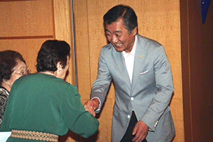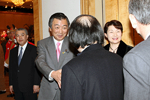 会場では記念写真大会の様相。麻生太郎会長はのどが嗄れてしまうほど熱心に参加者皆さんとの交流を楽しまれました。