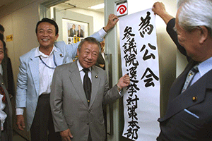 麻生太郎派「為公会」の初めての国会になります。麻生会長を囲み、弁当を突っつきながらの例会になりました。麻生会長からは、「参議院の選挙を控えているため会期延長をしない限られた日程での第166回通常国会になる 。教育改革、社保庁解体、国民投票法案など重要案件が山積している。議会運営は極めて難しく、心して取り組んでいかなければならない。注意すべきことは二点あり、ひとつは各地で保守分裂し保守同士が闘う選挙が展開されたり、政治と金の問題が起きたりして、政治の信頼を失いかねない状況にある。政策を進めるには政治が信頼を得なければ国民を説得することはできない。二つ目は教育改革や格差 是正問題などの取り組みが参議院選挙目当ての政策となれば、それも説得力を失う。国家100年の大計をもってことに当たらなければならない。」との趣旨の挨拶がなされました。政策集団「為公会」として各課題を整理し、独自の政策を作ることで合意されました。