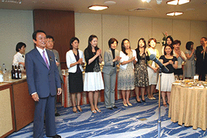 為公会メンバー全員が紹介され麻生太郎会長からの熱のこもった挨拶がなされました。その挨拶が終わると女性2名が花束を持って激励に登壇。そのお二人は斉藤慶子さんと高橋愛さんです。メンバーからも会長だけずるい、とため息・・・。