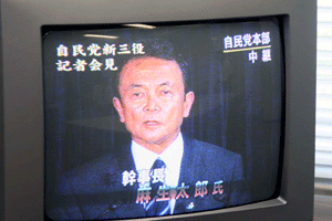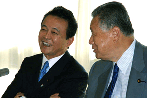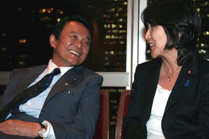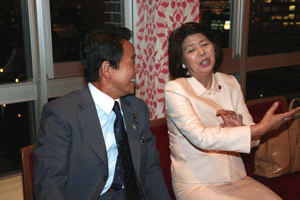麻生太郎先生が幹事長に就任し、自らが任命した副幹事長ら19名は、総裁選後そのまま留任ということになりました。麻生幹事長就任時に副幹事長が招かれ「これから頑張るぞ!」の懇親会が開かれましたが、総裁選終了、そのまま麻生幹事長は去ってしまいました。今日まで大変気になっていたようで、麻生先生からは「大変お世話になりありがとう」と感謝が述べられ、今夜の懇親会が一つのけじめになりました。開宴されてしばらくすると、麻生太郎先生 、細田代理、林筆頭の余興などが始まりました。その光景の写真を記念に撮りましたが、残念ながら「公開不可」と決定。でもメチャ楽しそうな場面を想像することは皆さんにもたやすいことで、麻生先生の笑顔(写真上)を見るだけで、なんとなく伝わってくるでしょう!