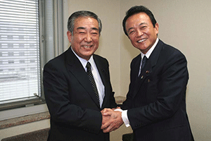 時間がない中で鈴木恒夫先生と打合せです。麻生太郎先生も面会のお客さんが会議室で待っていますから立ち話で・・・。話の内容は内緒。麻生太郎先生は今日も元気一杯でした。