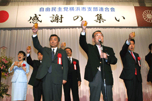 横浜ロイヤルパークホテルで「松本純さんと女性の集い」を終えて、東京へ向かいました。平成8年に一緒に初当選し、二期目に一緒に落選し、再二期目に一緒に復帰し、一緒に麻生太郎先生を応援している同志の桜井郁三先生の政治資金パーティーに出席しました。発起人代表の麻生太郎先生も千葉県のセミナーを終えて7時頃到着されました。いつもの麻生節で、洞爺湖サミットに向け環境副大臣として桜井郁三先生の活躍に期待していることを述べられました。