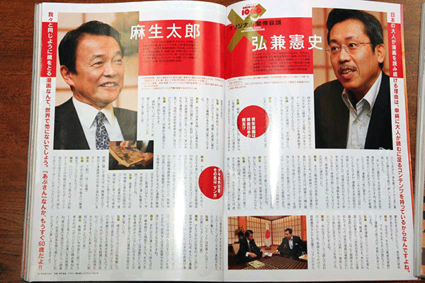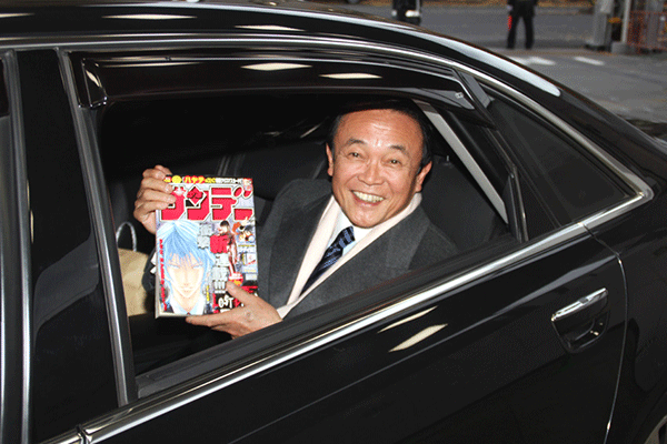 来客対応のため会館事務所に戻ると、お隣の麻生事務所にご本人がいて、次の予定に出発するため準備をされていました。ここで会っちゃいましたので、玄関までお見送りに行ったら、車の中から漫画を見せてニコニコ顔。車の中でしか漫画を読む時間はありません。これから一人で静かな時間を楽しむことになるのでしょう。麻生太郎先生は今日も元気一杯だ!
