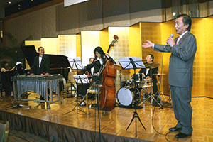 いよいよ開会時間になりました。ほぼ一杯の皆さんがお集まりになりました。この忘年会の趣旨は「感謝」です。いわゆる政治家パーティーと言われる会合のセレモニーは一切排除して、司会もなし、主催者の挨拶もなし、何よりも温かいお肉、お魚のパワー・ディナーを直ちに楽しんでいただきたい。そんな雰囲気のパーティーです。初めて参加された方はまごついてしまうかも知れません。開場の時から生演奏は続きます。JAZZバンドは私の東京薬科大学時代の同級生で、北里研究所の小曽戸洋教授がビブラフォンを、また製薬会社の堀江晴夫社長がギター、そしてJAZZ同好会の仲間が足りないパートをフォローしてくれます。