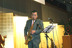 麻生太郎先生がお肉にナイフを入れた瞬間がポイントで、そこから私のディナーショウがスタートしました。曲はいつもと一緒なのですが、今年は新兵器にテナーサックスを持ち込みました。40年ぶりにテナーを吹いてみたのですが、音作りに重要な唇を締めることがなかなか出来ないばかりか、指もついてきません。そんな状況でしたが麻生太郎先生がお肉をぺろりと平らげるのを見て、音楽は終了し、ご挨拶をお願いしました。
