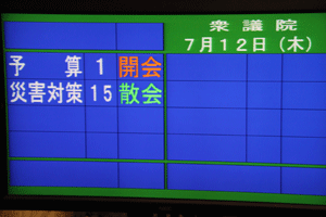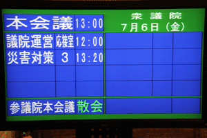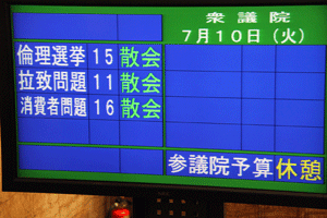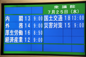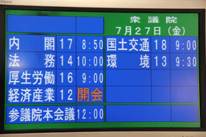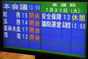 国会議事堂内の国会日程掲示板は、ご覧の通り真っ黒けで、何も予定がありません。民主党の造反議員処分などが終了し、委員長、筆頭理事などの差し替えが行われて初めて国会正常化の第一歩が踏み出されます。