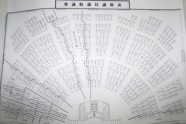 ご覧のように本会議場の議員席が変更されました。本来は右側から第1党、2党、3党と並ぶのですが、今回は民主党席を二つに分けるように並ぶことになりました。