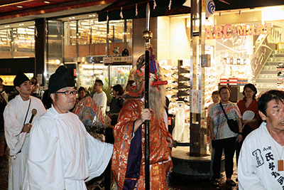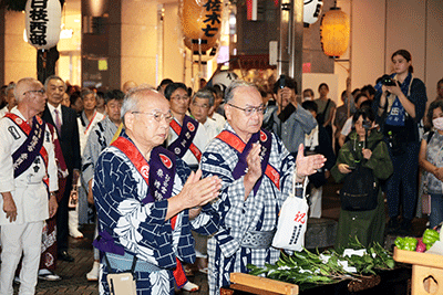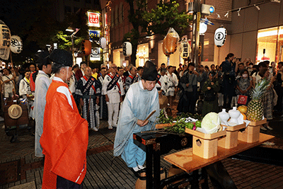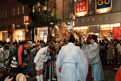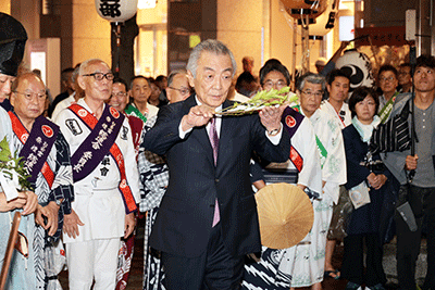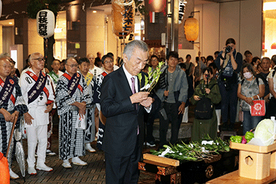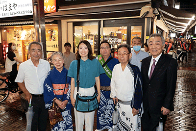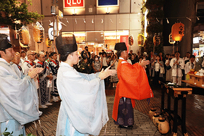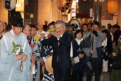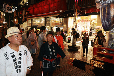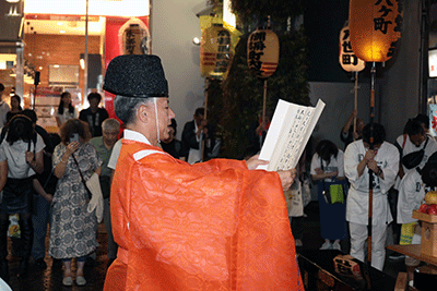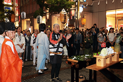 お三宮の宮日枝神社例大祭(還御)が伊勢佐木町の有隣堂前で斉行されました。松本純がお祝いに駆けつけ氏子各町の会長、役員の方々に例大祭のお喜びを申し上げました。例大祭は角井瑞宮司の祝詞奏上、玉串奉奠が行われ、例大祭役員の方々に続いて松本も玉串を奉奠し氏子各町と地域の安寧を祈願いたしました。神事後は神社神輿を牽引して伊勢佐木町を巡行いたしました。(秘書森報告)