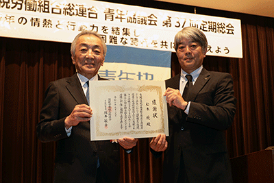 東京国税労働組合第69回定期大会が浅草橋ヒューリックホールで行われ松本純がお招きいただきました。定期大会の中、長年に渡り国税職員の定員・予算の獲得、処遇改善等に尽力して来た松本純に対し、同組合・志岐知幸執行委員長より感謝状が贈呈されました。