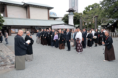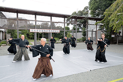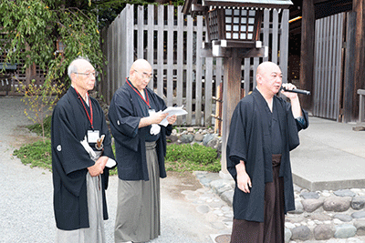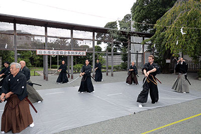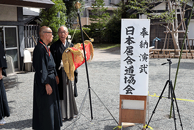 報告祭後は境内にて国家奉唱と写真撮影が行われ、田代表より「好天に恵まれ奉納演武が行われる事が出来たのも皆さんの日頃の行いが良いからだと思っています。本日は日頃の鍛錬の成果を思う存分発揮していただきたい」と代表挨拶がなされました。続いて顧問挨拶では松本より「晴天の中、田學道先生と多くの皆さんが集まり奉納演武会が行われることにお喜び申し上げ日頃の鍛錬の成果を発揮されますことをお祈りいたします。またこの歴史伝統文化を大切に日本を立て直していただければと思っています」とご挨拶し、後任の丸尾支部長をご紹介しました。松本から紹介を受け丸尾支部長より挨拶がなされ、続いて顧問挨拶が行われた後、奉納演武が始まりました。(秘書森報告)
