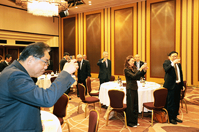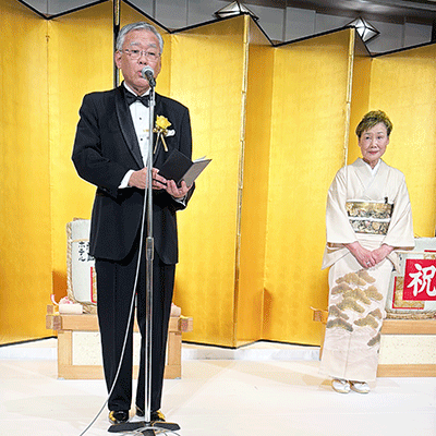 続いて発起人、来賓の皆様による鏡開きが華やかに行われ、松本純より乾杯挨拶がなされました。「同じ昭和25年生まれの東京薬科大学同窓生。当時部室が地下にあり、山本さんが所属していたのが写真部、私は軽音学部でジャズベースを弾いていた。写真一枚の中に何を表現するか、何を主張するか、非常に緻密な計算ができていたのが山本信夫さんでした。それはまさにスペシャリストとしての力を発揮していたと言えるのではないかと思います。一方私はベース、休みなくリズムを刻み続け、全体のハーモニーをどうやってつくり上げるかというのがウッドベースの役割で、言ってみれば人をまとめるジェネラリストです。山本さんが日本薬剤師会の会長をされていた10年間を翻って、スペシャリストとして中医協で戦ってもらう部分と、役所をまとめ、三師会で協力をし、議員さんを説得するという、松本のジェネラリストとしての仕事の両方が相まってはじめてこの10年間を乗り越えることができた、と感じているところです。これからも山本さんにはさらに戦ってもらって、ここにお集まりの皆さんと力を合わせて日本をさらに発展する幸せな国にしてもらいたいと思います。山本信夫先生、本当におめでとうございます!乾杯!」会場全員がお祝いの気持ちを込めて杯を上げました。