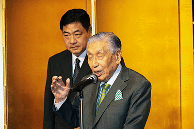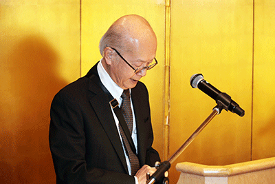 続いて山本信夫先生より謝辞が述べられました。「先ほど身に余るお言葉を皆様からいただきましたが、今回このような章をいただけましたのは、今日お集まりの皆様方のご支援とご尽力のたまものでございまして、決して私一人の力ではございません。ですからここにいらっしゃるお一人お一人に、大変沢山の思い出があります」と述べ、特にお世話になった方々を挙げた中で「松本純先生とは東薬の卒業以来50年という長い付き合いで、先生が国会議員になられた後は、政治とは何か、政治家、また政治との距離感というものを色々な機会を通じて教えてもらいました」との言葉をいただきました。最後に奥様、ご家族に「長い間支えてくれた私の大事な宝物」と感謝を贈られました。