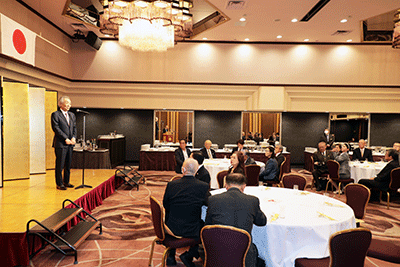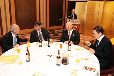 歓談が続く中、歴代専務理事近況報告となり、松本は今春、旭日大綬章の栄に浴し天皇陛下より勲章をいただいた内容を報告しました。そして、「大事なのは友達で、出会いがあって深い付き合いをして信頼関係を作り上げた仲間が一生の宝物です。この宝物をいかに作り上げ維持できるかが皆さんの幸せに必ず繋がって来ます。皆さんも一つ一つの出会いを大切にされ、これから大いなる活躍していただく事をご祈念申し上げます」と若き皆さんにエールを送られました。(秘書森報告)