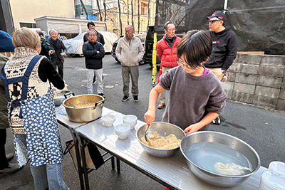 恒例の柳通り会餅つき大会が野毛産業駐車場で開かれ、山田孝次会長はじめ大勢の方々が参加されました。大人に混じって松本の孫の将君も初めて餅つきに挑戦、元気に杵を振り下ろしました。つきあがったお餅は手際よく丸められ、餡ころ餅、きな粉餅、磯辺巻き、辛味餅、雑煮になり、皆で美味しくいただきました。(秘書鈴木報告)