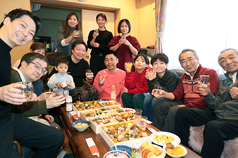 初詣に続き、小さな自宅に大勢がギュウギュウ詰めで皆さん健康な新年となりますよう乾杯し、お節とお雑煮を楽しみました。今年の初参加は、4人目の孫「悠(はる)」君と弟・松本研の長男・誠のお嫁さん「しおり」さんでした。