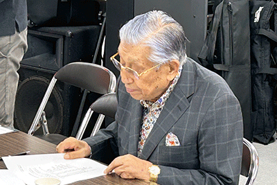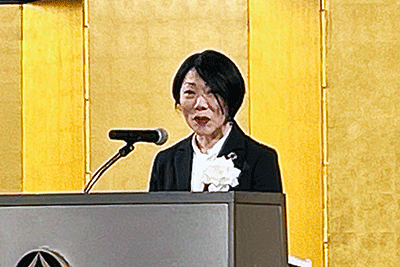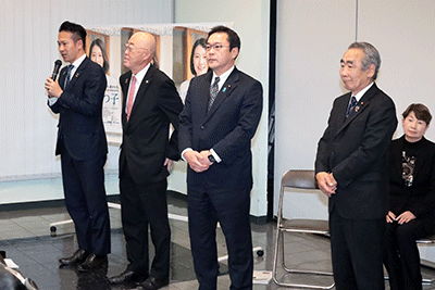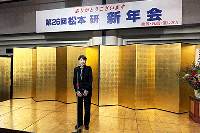 続いて松本純代理として出席した真純夫人より、「新年おめでとうございます。また恒例の研先生の新年会が盛大に開催されたことをお喜び申し上げます。1996年、平成8年に衆議院選挙の挑戦。それに伴い研さんの中区市議補選、二つの選挙が同時に行われました。今から丁度30年前の話しです。その時選対本部長として指揮を取っていただいたのが58歳だった村上健司県会議員でした。非常に難しい選挙に勝ち上がるために純、研、どっちが国でどっちが市議補選か。混乱するとの事から同時の支援者の合言葉は名前まで書かない『松本。松本。自民党』という合言葉でお願いして歩いた事を昨日のように覚えております。その尊敬する村上先生が昨年末、87歳で逝去されました。誠に寂しいことでご冥福を祈っております。私自身も30年間に亘る議員活動に全力で取り組み、多くの成果を得ることが出来ました。引退を決意しましたが、その間、支援者の皆さん、業界の皆さんに支えられ政治の秩序を維持することが出来たことを誇りに思います。また研先生におかれましては、私の後継として市議を引き継ぎ、もっぱらバッチが付くとそっくり返ってしまう議員が多い中、高い木から降りてコツコツと地元を回り続けて8期生にもなりました。変わらぬ努力を継続することは中々難しいことです。その取り組みに敬意を表します。仏教で言う諸行無常の通りですから研先生のこれまでの経験や知見を次の若者たちに伝えて行く活動にも取り組んでいただきたいと願っています。本年の益々のご活躍を祈り祝辞といたします」と松本純の祝辞を代読されました。