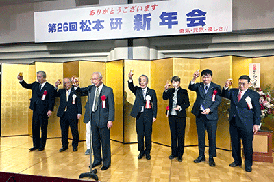 第26回松本研新年会がローズホテル横浜で開催されました。松本研市議、神田後援会長、永田実行委員長が登壇し、出席者全員で「一月一日」と「横浜市歌」の斉唱が行われました。続いて神田信男後援会長の挨拶と来賓挨拶となり、脇雅昭参議、原聡祐県議 が祝辞を述べました。