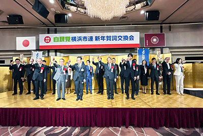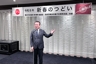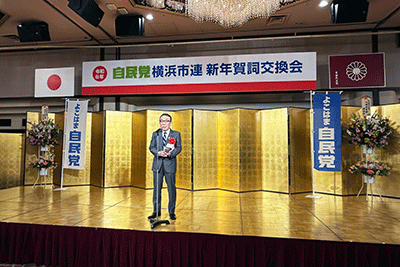 自民党横浜市連はこの1月をもって創立70周年を迎えることになります。この歴史と伝統は先達の議員の方々が横浜市民の安定した生活を守る信念のもと、無党派層が多く大都市特有の党勢を維持する難しさに苦慮しながら懸命に積み重ねてきたかけがえのない70年の歴史であります。過去には誕生から10年も経たず消えていった政党がいくつあったでしょうか。確かにその時代背景にあったり、政治に不信感を持ったり、自民党離れが起き一時的に改革政党が人気を集めることは有りましたが、それらの政党が長く続くことはありませんでした。自民党は頼れる責任政党として信頼を回復して行かなければなりません。人材豊富な自民党内において政権交代が起き初めての女性総理が誕生し保守層の支持が回帰して来ています。また、大胆にも少数政党の人気ある政策を包含するスピード感を持った政策判断などその勢いが評価され高市政権の支持も高く自民党の支持率も少しずつではありますが復調基調になって来ました。私たちはこのチャンスを逃すことなく党の信頼回復に努め、これからも70周年の伝統の重さを誇りに思い、市民の生活を守り責任政党の役割りとして辛抱強く厳しい時代を乗り越え所属議員と党員党友の皆さまが力を合わせて横浜を発展させるため新しい時代を切り開くこと。これを基本理念とし邁進して参ります」と新年挨拶がなされました。
