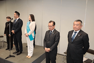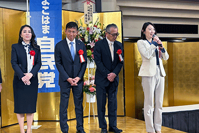 急ぎ駆けつけた脇雅昭参議からも激励の弁がなされました。激励を受けた自民党神奈川1区支部・丸尾なつ子支部長からは、自身の生い立ちから経産省入省を経て弁護士となり、政治の道を志した思いが述べられました。