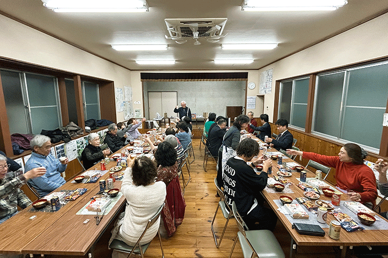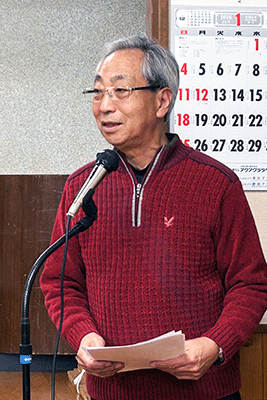 飯恚v典会長より「皆さん、おめでとうございます。昨年末に行事も無事に終了し、今年も残りの事業を進めて参りますのでご協力をお願いいたします。今年は午年で、午年は変化が多い年と言われています。西大道町内は典型的な少子高齢化の町内会です。今日は多くの皆さんに参加いただき大変ありがたい事だと思っています。最近は転居者が多く公園で小さなお子さんたちを見かけるようになりました。今年はお子さんたちが多く集まっていただけるような年になれば良いなと思います。皆さんご協力をよろしくお願いします」と挨拶されました。