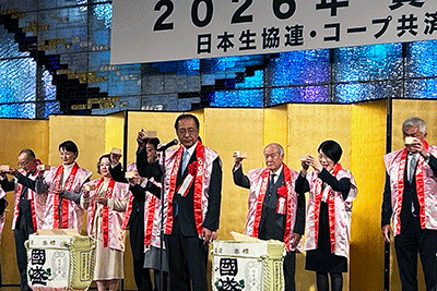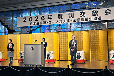 日本生活協同組合連合会・新井ちとせ代表理事会長、日本コープ共済生活協同組合連合会・笹川博子代表理事理事長、日本医療福祉生活協同組合連合会・橋淳代表理事会長理事の3連合会共催2026年新年賀詞交歓会がホテルニューオータニで盛大に開催されました。