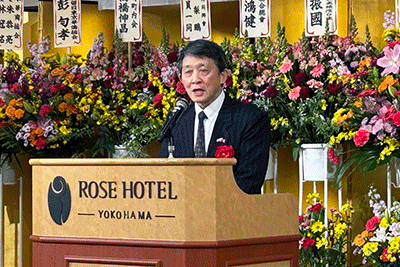 馬車道商店街協同組合新年賀詞交換会がアパホテル&リゾート横浜ベイタワーで開催され、始めに来賓者紹介で選挙区の国・県・市の議員、山中竹春市長、横浜商工会議所・上野孝会頭、中税務署・高盛洋明署長、加賀町警察署・木村一署長、中消防署・田邊栄久署長が紹介されました。続いて同協同組合・六川勝仁理事長より、「昨年の馬車道を振り返ってみますと11月に旧第一銀行横浜支店にバンクパークヨコハマが開業しました。この近隣の開発では北仲エリア、海岸通り、関内駅前の開発エリアと着々と進んでいます。この大規模開催は馬車道にとってマイナスになるのではなく、お互いWin-Winの関係が築けるような街づくりに取り組んで参りたいと思っています。話しは変わりますが皆さん開港5都市景観街づくり会議があるのはご存知でしょうか。阪神大震災の神戸からスタートしました。神戸、長崎、函館、新潟、横浜の5都市を順番に回って会議をして行きます。共通課題も色々あります。民間レベルの会議です。馬車道としても取り入れるべきものは積極的に取り入れて参りたいと思います。毎年お話ししておりますが、観光都市横浜にはプロムナードが少ないのではないかと思っています。2019年に横浜市の多大な協力をいただいてガス燈のプロムナードが完全いたしました。馬車道から海岸通り、山下公園通りまで170基が設置され多くの市民の方々に楽しんでいただいています。昨年の暮れに連合町内会の新田(東一)会長、山下公園通り会・原(信造)会長、関内街づくり振興会の秋山会長と私の4名で県警に伺いプロジェクト(プロムナード延伸)について説明して参りました。時間のかかるプロジェクトになるかも知れませんが、是非とも皆さま方の応援をよろしくお願いしたいなと思います。今年は馬車道に縁のある午年です。跳ね馬のごとく頑張ってしっかりと跳ねて行きたいなと思います」と念頭挨拶を述べられました。続いて来賓代表として山中市長が祝辞を述べられ、横浜商工会議所・上野会頭の挨拶と乾杯の発声で歓談となりました。(秘書森報告)