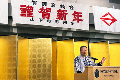 続いて同町内会・高橋伸昌会長より、「新年あけましておめでとうございます。獅子舞はいかがでしたでしょうか。山下町町内会は『住んでよし。働いてよし。訪れてよし。日本一楽しい町内会。山下町町内会』ということで1年間やって参りました。本年も丙午ということで躍動感を持ちながら進んで参りたいと思います。町内会は今年をもって67年目を迎えます。山下町は全て番地の町内会です」と話され、町内会として誕生した年表、人口とエリアの説明、町内会の取り組みと行事について説明がなされました。そして「我々は地域に支えられています。地域が認めてくれるから私たちが活動出来る。今日お集まりの地域の皆さんには心から感謝を申し上げます。私にとって山下町は生まれ育った町です。子どもたちにとって山下町が心に残るふるさとになってもらいたい。町と町の中での人の繋がり、人の交差点を、沢山の交差点を作っていきたいと思います。山下町町内会は日本一楽しい町内会を目指します」とご挨拶されました。
