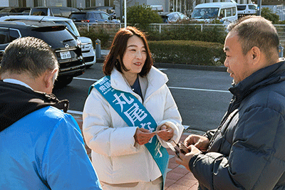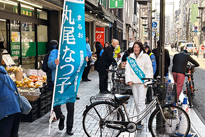 アピタ金沢文庫店前で街頭演説を行いました。行き交う人々やバス待ちの方々に向けた活動で、丸尾候補は多くの有権者にビラを配布し握手を交わしました。(秘書森報告)