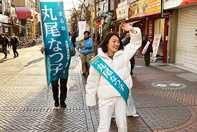 六浦のエステシティ〜金沢八景駅前〜瀬戸神社前で辻立ちを行いました。夕暮れの中、車中や沿道から激励を受け、丸尾候補は力強く国政に臨む決意を訴えました。(秘書森報告)